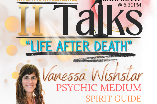 Purchase the recorded event (coming soon). EVENT DATES: II TALKS: “Life After Death”Friday., January 30th @ 6:30pm at UUFVBPLEASE register to save your seat. (In-Person EVENT)Fri., Jan. 30th 2025 Location:Unitarian Universalist Fellowship of Vero Beach1590 27th Ave. Vero Beach, FL 32960(772) 778-5880 (Intuitive Intelligence)II TALKS series presents: “Life after Death”Hosted by: Vanessa Wishstar, Psychic Medium& Evolution of Consciousness non-profit Friday, Jan. 30th @ 6:30pmat UUFVB. Join us for a live, intimate conversation with Vanessa Wishstar, Psychic Medium, where she shares in … Continue reading II TALKS: “Life After Death”