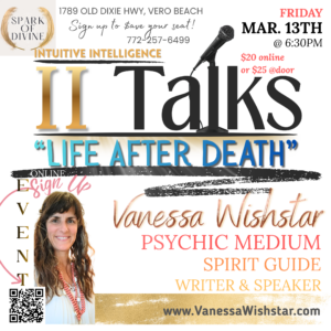 Spark of Divine presents a live, intimate, in-person conversation with Vanessa Wishstar, Psychic Medium, where she shares, in-detail the very foundations of how to connect with those who’ve crossed over in these II TALKS series: “Life after Death”.
