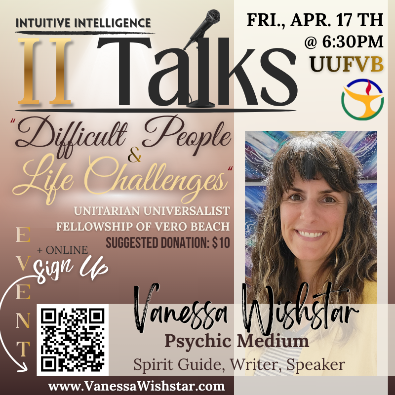 Join Vanessa Wishstar, Psychic Medium for II TALKS: Difficult People & Life Challenges — an evening of intuitive teaching methods and guided greater understanding, dismantling our ingrained belief systems that keep us locked into a reactionary response. How to authentically show up when relationships feel impossible, boundaries are blurred, and/or life keeps handing us one hard thing after another. Learn from someone who continues to walk this path, receiving ways to free yourself from the shackles of life.